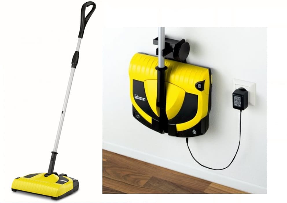Электровеник Karcher K 65 Plus имеет конструкцию, позволяющую подметать вплотнyю к стенам. Зазор между стандартной насадкой и стеной, по заявлению производителя, составляет не более 1 мм. Длина телескопической трубки регулируется от 100 до 125 см. В комплекте также имеется кронштейн для подвешивания на стену.